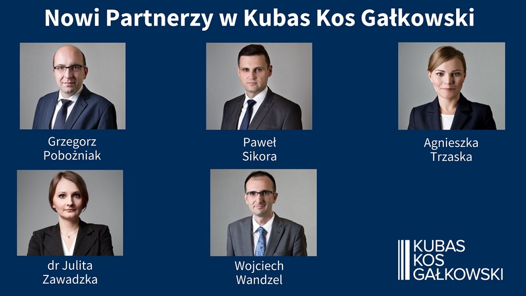 Z przyjemnością informujemy, że z dniem 28 października 2016 roku do grona Partnerów Kancelarii Kubas Kos Gałkowski dołączyli adwokaci: Grzegorz Pobożniak, Paweł Sikora, Agnieszka Trzaska, Wojciech Wandzel i dr Julita Zawadzka.