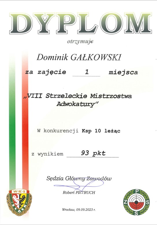 9 września 2023r., we Wrocławiu, odbyły się VIII Strzeleckie Mistrzostwa Adwokatury, w których udział wzięło 85 zawodników. Podczas wydarzenia uczestnicy mieli możliwość udziału w 4 konkurencjach: pistolet sportowy, pistolet centralnego zapłonu, karabin sportowy i w konkurencji trap.