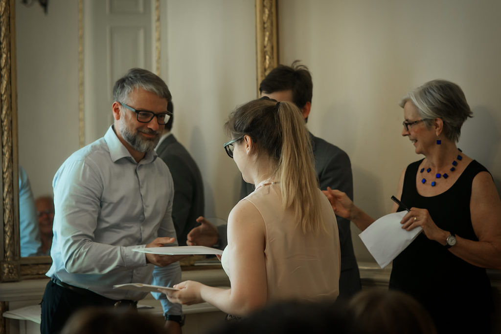 Zebranych przywitał prof. dr hab. Jerzy Pisuliński, dziekan Wydziału Prawa i Administracji Uniwersytetu Jagiellońskiego w Krakowie. Następnie prof. Leah Wortham, kierownik Szkoły z ramienia CUA oraz dr Rafał Kos wręczyli dyplomy sześciu najlepszym studentom Szkoły. Szczególne gratulacje dla Pana Iwo Jarosza oraz Pani Anny Janiec, którzy otrzymali stypendium Kubas Kos Gałkowski.